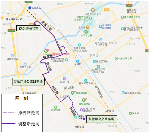 原走向:從鹽城火車北站發(fā)車,途經(jīng)開放大道、黃海路、文港路、毓龍路、建軍西路、鹽馬路、大慶西路、西環(huán)路、新都路、鹽城路、園中路,發(fā)往科教城公交回車場。調(diào)整后走向:從汽車客運北站發(fā)車、開放大道、黃海路、文港路、毓龍路、建軍西路、鹽馬路、大慶西路、西環(huán)路,發(fā)往萬達廣場公交回車。