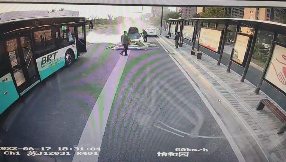 當(dāng)天18:29分左右,張華飛駕駛K401公交車,由南往北行駛至怡和園公交站臺(tái)時(shí),發(fā)現(xiàn)前方一輛電動(dòng)三輪車冒起滾滾濃煙,車上的木板材散落一地。車主老大爺正拿著一件衣服不停拍打火苗,試圖救火。